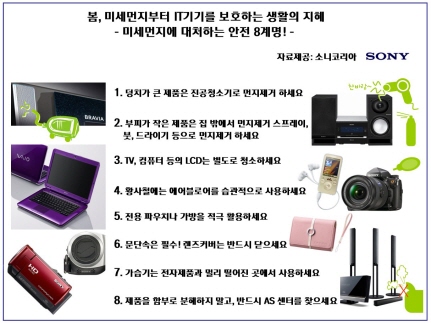 특히 야외활동이 잦아지는 봄을 맞아 디지털카메라, MP3 플레이어, 노트북 등 외부에서의 사용이 빈번해지는 휴대용 IT기기와 TV, 홈시어터, 오디오 등 고가의 대형 가전제품을 황사로부터 보호하는 생활의 지혜를 알아본다.