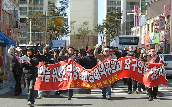 | ▲신창부영3차 비상대책위와 임차인들이 지난 14일 ‘부영의 편법분양 문제, 일방적 분양전환 중지 및 입주민과의 성실한 협의 촉구를 위한 요청하는 제2차 결의대회’를 개최한 후 주변 상가를 행진하고 있다. |