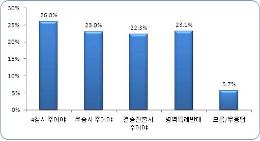 연령별로는 20대가 병역특례 혜택 찬성이 80.7%로 가장 높게 나타났고, 30대(73.6%), 40대(67.2%), 50대이상(66.4%) 순으로 조사됐다. 혜택의 유형별 응답에서는 50대 이상 연령층은 현재 성적으로도 병역특례 혜택을 받을 자격이 있다는 의견이 28.3%로 가장 높게 나타난 반면, 20대는 결승진출시에만(28.9%), 30대는 우승시에만(27.0%) 주어야 한다는 의견이 가장 많아 세대간 의견차를 보였다.