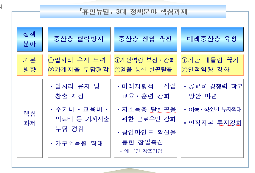 정부는『휴먼뉴딜』의 3대 핵심 정책방향을 ①중산층 탈락방지, ②중산층으로의 진입 촉진, ③미래 중산층 육성으로 나누어 체계적으로 추진하기로 하였다.