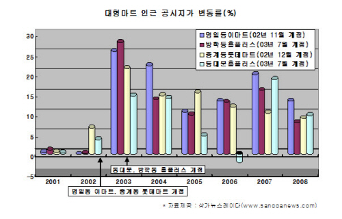 중계동 롯데마트의 경우 마트 개점 전인 2000년부터 2002년 사이 평균 3.5% 정도의 공시지가 상승률을 보였지만, 마트 오픈 직후인 2003년 공시지가는 2002년도에 비해 21.4% 증가했다.