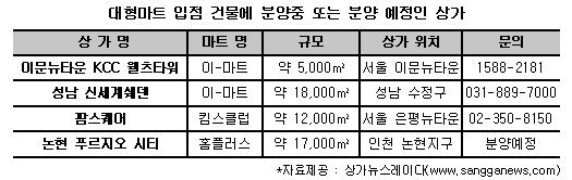 성남 신세계쉐덴의 경우 지하 1, 2층에 18,000㎡ 규모의 이마트가 입점 예정으로 지상 1층 상가를 일반 투자자에게 분양하며, 팜스퀘어는 12,000㎡ 규모의 킴스클럽이 입점한 상태에서 지상 층을 분양 중이다.