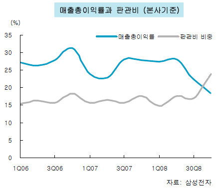 실제로, 삼성전자는 가깝게는 지난 2007년 약 10조 4000억원의 판관비(판매관리비용)를 투입, 16조 3000억원의 매출 총이익을 기록했으며, 지난해 3분기 약 3조 3000억원의 판관비를 투입, 4조 3000억원의 매출총이익을 얻었다. 하지만, 지난 4분기에는 약 4조 4000억원의 판관비를 투입했지만 약 3조 5000억원의 매출총이익을 기록해 연결기준 8년만에 사상 최대의 적자를 기록했다.