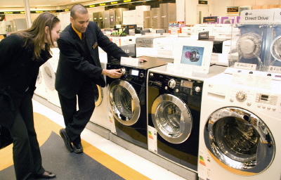 | <영국 런던에 위치한 전자유통업체 '코멧(Comet)'매장을 방문한 여성고객이 판매원으로부터 LG스팀 드럼세탁기 설명을 듣고 있다.> | ||