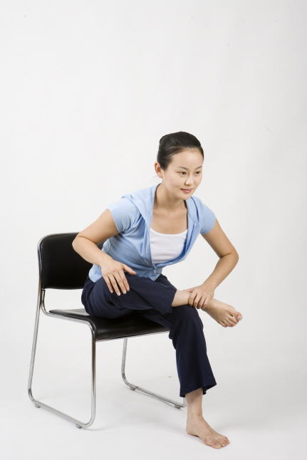 2) 의자에 바로 앉은 자세에서 오른쪽 발목을 왼쪽 무릎 위에(4자모양) 올려 놓고 가슴을 멀리 미는 듯한 느낌으로 상체를 천천히 아래로 숙인다. 이때 양손은 무릎 위에 살며시 올려 놓는다. 좌,우 2회 15초 유지.