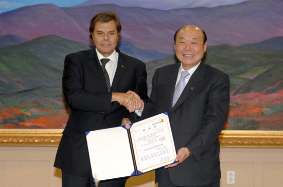 [프라임경제]박광태 광주시장은 24일 시청 3층 비즈니스룸에서 2009광주세계광엑스포 빛 축제 총괄감독에 前프랑스 리옹 빛 축제 총괄감독이며 조명전문가인 알랭 귈로(Alain Guilhot)에게 위촉장을 수여하고 환담을 나눴다.