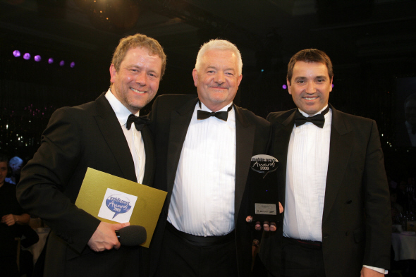 | <LG전자가 영국 최고 권위 휴대폰 업계 시상식 '모바일 뉴스 어워드'서 '2009 최고의 휴대폰 제조 업체'와 '최고의 혁신 제품'으로 선정돼 2관왕을 달성했다. 사진 속 인물은 좌로부터 코메디언이자 시상식 사회자 존 컬쇼, LG전자 영국법인 판매/마케팅이사 존 바튼, 행사 스폰서 아브니르텔레콤 CEO 앤디 토우.> | ||