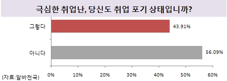 아르바이트 구인·구직 포털 알바천국이 20대 졸업생 및 취업준비생 772명을 대상으로 ‘극심한 취업난, 당신도 취업포기 상태입니까’를 조사한 결과, 그렇다 43.91%, 아니다 56.09%로 응답, 10명중 4명이 취업포기 상태인 것으로 조사됐다.