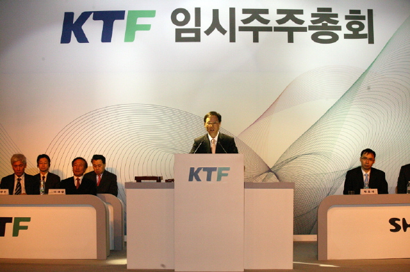 | <27일 서울시 송파구 올림픽파크텔에서 진행된 ‘임시 주주총회’에서 KTF 권행민 대표이사가 합병계약 승인 안건을 결의하는 모습.> | ||