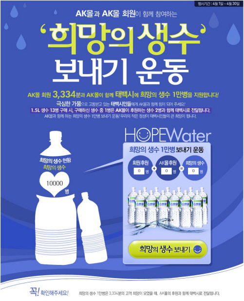 AK몰 초기 화면 이벤트 페이지에서 희망의 생수 보내기 버튼을 클릭하여 1.5L생수 13병들이 1세트를 구매하면 12병은 고객에게 가고, 나머지 1병은 태백시에 지원하게 된다. 여기에 AK몰이 고객 한 명 당 추가로 2병의 생수를 지원한다. 행사기간 동안 판매되어 모인 생수는 태백시민에게 전달된다.