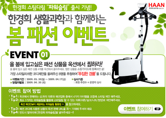이번 행사는 옥션의 쇼핑 지식 코너 ‘옥션 쇼핑백과(review.auction.co.kr)’에서 진행하며 옥션 회원이면 누구나 참가할 수 있다. 참가 방법은 옥션에서 판매하고 있는 상.하의 의류와 패션 아이템으로 봄에 어울리는 패션 스타일을 구성해 이벤트 페이지에 등록하면 된다. 최대 4개의 아이템까지 활용할 수 있으며 기본 참가 사항으로 한경희생활과학의 스탠드형 스팀다리미 '한경희스팀다림 Power Slim’ 으로 스타일을 살릴 수 있는 실크, 쉬폰, 니트 소재의 의류 및 정장 중 최소 한가지는 들어가야 한다.