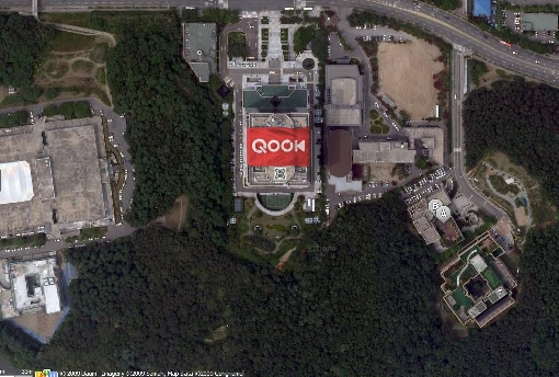 | <지난 3월 네티즌들의 호기심을 유발시키며 화제가 됐던 DAUM 항공서비스 '스카이뷰'에 잡힌 사진. 사진 속 QOOK 문구가 KT의 새 브랜드를 알리는 현수막이라는 사실과 해당 건물이 KT본사라는 사실이 알려지며 눈길을 끌었다.> | ||