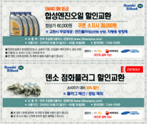 쿠폰을 소지한 고객은 전국 오일뱅크플러스를 방문시 5w-40 합성엔진오일을 3만9000원에 교환해주며, 엔진플러싱 및 방향제를 무료로 제공하고 있다. 또한 덴소니켈 플러그 30%할인된 가격으로 교환 받을 수 있다. <가맹점 찾기 www.oilbankplus.com/ 문의전화 1544-9589>
