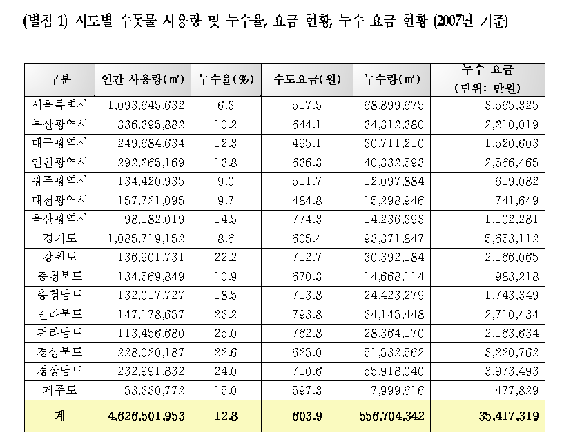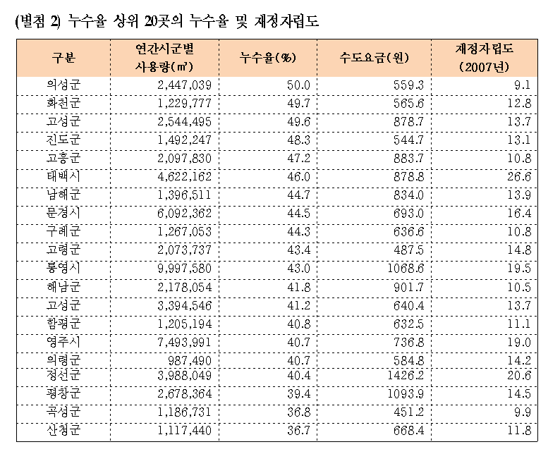 한나라당 이정현 의원(예산결산특별위원회)이 환경부로부터 제출받은 ‘지역별 수돗물 사용량 및 누수율, 요금 현황’을 분석한 결과, 전국의 수돗물 누수율은 평균 12.8%인 것으로 나타났다. 전국 165개 시 군 중에서 가장 누수율이 높은 곳은 의성군으로 50%의 누수율을 나타냈고, 40% 이상의 수돗물이 누수 되는 지역 역시 17곳이나 되는 것으로 집계되었다.
