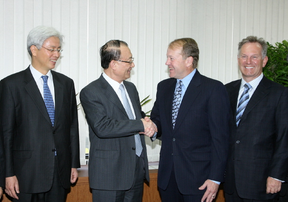 | <최시중 방송통신위원장은 14일 한국을 방문 중인 네트워킹 분야의 세계 최대 기업인 시스코 시스템즈의 존 챔버스 회장과 면담을 갖고, 시스코의 IT 관련 한국 투자 계획에 대해 의견을 교환했다./좌로부터 네 번째가 존 챔버스 회장. > | ||