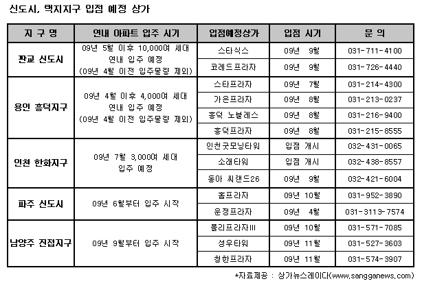성남 판교에서는 스타식스와 코레드프라자가 올해 9월부터 상가 입점을 시작하기 위해 공사가 한창이며, 용인 흥덕지구도 스타프라자를 시작으로, 가은프라자, 흥덕프라자, 흥덕 노블레스 등의 중심상업지구 내 상가들이 7월부터 상가 입점에 들어갈 예정이다.