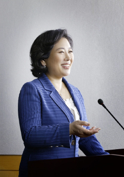 | <세계 최고 높이의 초고속 엘리베이터 테스트타워를 완공한 준공식 현장에서 기념사를 하고 있는 현정은 현대그룹 회장.> | ||