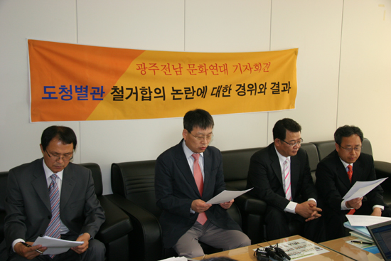 광주전남문화연대(상임대표 김하림)는 16일 오전 11시에 광주시청 기자실에서 기자회견을 갖고 “도청 별관을 철거하는 데 합의했다는 주장의 근거는, 2006년 2월 20일 5.18 재단을 포함한 오월 4개단체가 아시아문화전당 추진기획단장 앞으로 보낸 공문의 작성자와 작성경위에 대한 내용이 자세하게 설명돼 있다”고 주장했다.