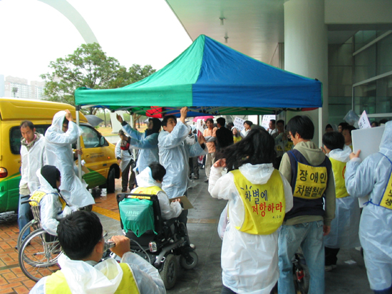 비가내리는 이날 기자회견에 참석한 30여명의 장애인들은 ‘U대회 보다는 활동보조’, ‘U대회보다는 특별교통수단 도입’, ‘나는 시설에서 살기 싫을 뿐이고, 지역사회에서 살고 싶을 뿐’ 등이 쓰여진 손 푯말을 지참했다.