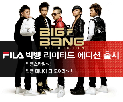 www.abcmart.co.kr)는 오는 4월23일부터 5월 31일까지 빅뱅이 직접 디자인한 '휠라 빅뱅 리미티드 에디션 제품 ' 을 최대 30% 할인된 가격에 판매한다. 휠라 빅뱅 리미티드 에디션은 이탈리아 스포츠 브랜드 휠라의 전속 모델인 빅뱅 멤버들이 직접 디자인한 참여한 신발과 가방 등으로 구성되어 있으며, 아이돌 그룹 빅뱅 멤버들의 스타일리시한 스트리트 룩이 돋보이는 제품들이다.