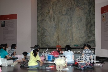 | ▲ 제24회 어린이문화재그리기 대회에 참가하여 서산 삼존마애불을 열중해서 그리고 있는 어린이들 |