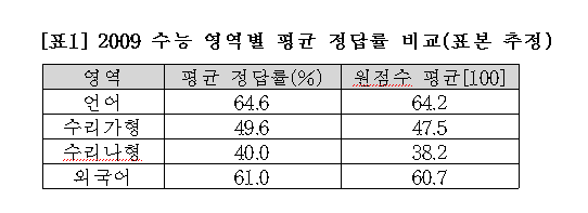 영역별 평균 정답률은 수리 영역이 어렵게 출제되는 관계로 수리나형이 40.0%로 가장 낮아 어려웠고, 수리가형도 49.6%로 정답률이 낮게 나왔으며, 외국어영역은 61.0%이었고 언어영역은 64.6%로 다른 영역에 비하여 상대적으로 높게 나타났다.