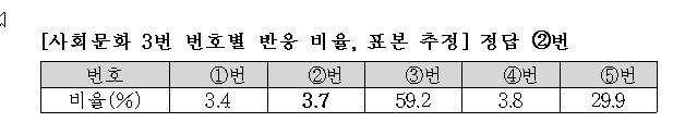 그리고, 사회문화 3번 문제에서 오답이 가장 많이 나오게 된 이유는 대다수 응시생들이 보기 내용 중 자료 표현에 함정이 있는데 이를 간과하였고, 보기 자료를 해석하는 데 있어서도 응답자의 비율을 단순히 더하는 실수를 범하였기 때문이다.