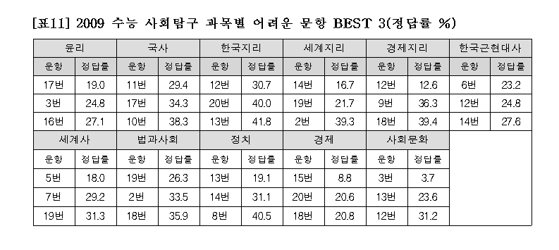 국사는 11번 통일 신라의 수취 제도와 민정문서(정답률 29.4%), 한국지리 12번 인구 구조에 대한 도표 해석(정답률 30.7%), 한국근현대사 6번 해방전 한인 인구 변동에 대한 통계 해석(정답률 23.2%), 정치 13번 선거 결과와 정치 제도(19.1%) 문제 등이 어려웠다.