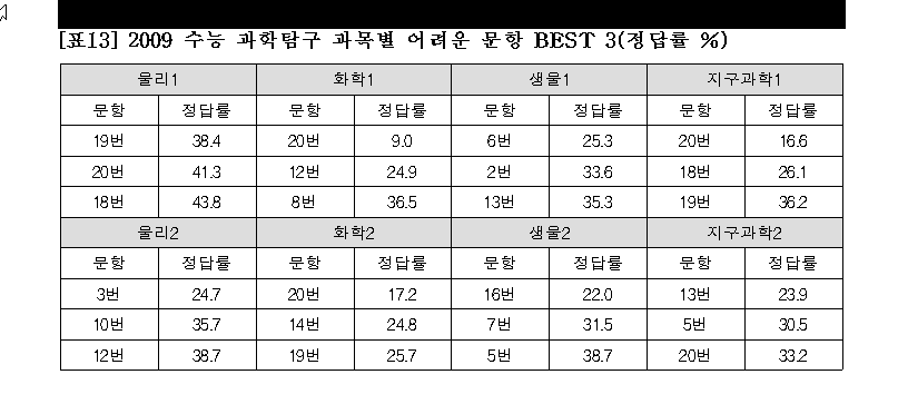 사회탐구 영역은 사회문화의 3번 문제가 정답률 3.7%로 이례적일 정도로 가장 낮게 나와 오답률이 지극히 높게 나왔고, 과학탐구 영역은 화학1의 20번 문제가 정답률 9.0%로 가장 낮은 것으로 나타났다.