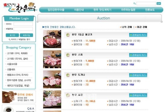 구매자가 2명 이상이면 20%저렴한 가격에 1등급한우를 발송해 주고 있다. 온라인 천원경매도 공동구매와 함께 인기를 더하는 이벤트. 한우품목당 천원부터 시작되는 천원경매는 마감시점이 되면 경쟁이 더욱 치열해진다.