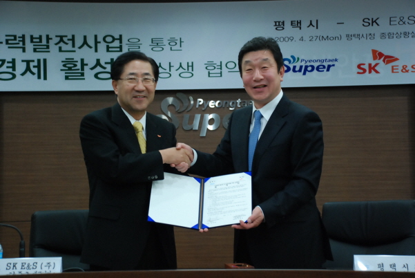 | SK E&S 김중호 대표(좌측)와 송명호 평택시장이 '지역경제 활성화 및 민생안정을 위한 상생협력 협약식'을 가졌다. | ||