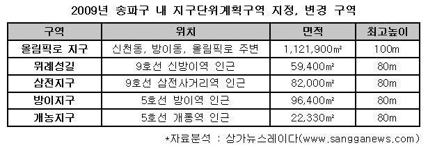 올해 지정, 변경된 잠실 일대 지구단위계획구역은 올림픽로 지구, 송파대로 지구 등의 대로변과, 위례성길, 방이지구, 삼전지구, 개농지구 등 5, 9호선 역세권 및 역세권 예정 지역이다.