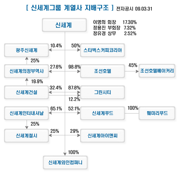 신세계그룹은 백화점과 할인점 이마트를 주축으로 한 유통사업 외에 신세계첼시, 신세계건설, 신세계푸드시스템, 조선호텔, 신세계인터내셔널 등 14개의 계열사를 거느린 그룹으로 성장했다.