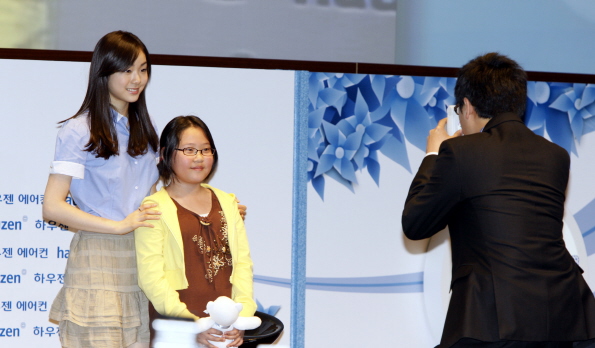 | <서초동 삼성전자 빌딩에서 하우젠 고객 300여명이 참석한 가운데 성황리에 개최된 삼성전자 하우젠 에어컨 '씽씽 쇼케이스 김연아, 그 두 번째 바람이 붑니다'에서 김연아 선수가 씽씽댄스를 선보인 한 초등학생 관람객과 사진을 찍고 있다.> | ||