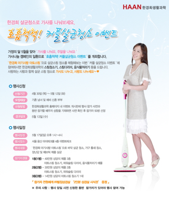 생활가전 기업 한경희생활과학(대표 한경희, www.ihaan.com)은 가사 나눔 캠페인 ‘가사를 나눠요. 주말을 나눠요’ 의 일환으로 ‘호흡척척! 커플 살균청소 이벤트’를 개최한다고 30일 밝혔다.