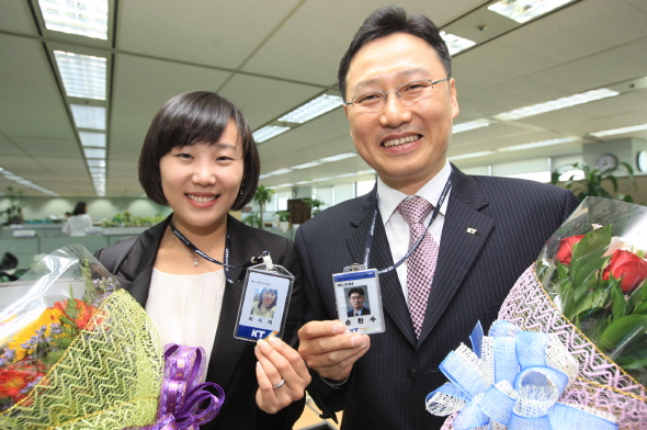 | <분당 KT 본사 사옥에서 KT로 발령 받은 직원들이 KT신분증을 보이고 있다.> | ||