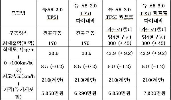 특히, 뉴 A6 3.0 TFSI 콰트로 모델은 국내에는 처음 선보이는 강력한 성능의 3,000cc TFSI 수퍼차저 가솔린 직분사 엔진을 탑재해 최고출력 300마력, 최대토크 42.9kg∙m, 0=>100km/h 5.9초로 동급 최강의 성능을 자랑한다. 국내 공인연비는 8.0km/리터, 최고속도는 210km/h(안전속도). 이전의 A6 3.2 FSI 콰트로 모델에 비해 출력은 45마력, 토크는 9.2kg.m가 커졌고, 0=>100km/h는 1.2초 빨라졌다.