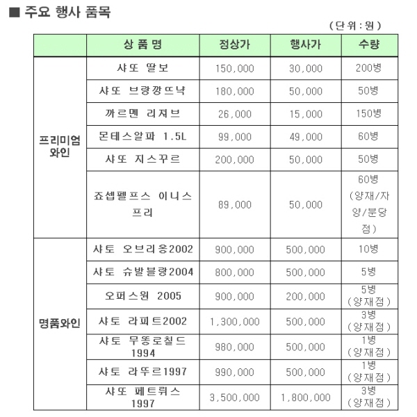 그 외에도 전세계 와인 애호가들의 필수 수집 아이템인 명품와인 샤토오브리옹(정상가: 90만원/10병한정)과 샤토슈발블랑(정상가: 80만원/5병한정)을 각각 50만원에 판매하며, 샤토라피트(정상가: 130만원/ 양재점3병한정)와 샤토무똥로칠드(정상가: 98만원/양재점1병한정)도 각각 50만원에 판매한다.