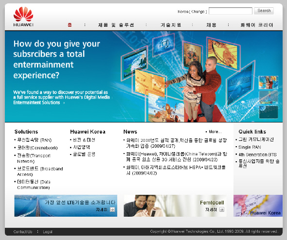2002년 한국 시장에 첫 진출한 이후, 역량 있는 국내 파트너들과 전략적 비즈니스 파트너쉽을 확보해 온 화웨이코리아는 이번 한국어 홈페이지 개설을 통해 자사의 다양한 제품, 솔루션 및 기술에 대한 정보를 국내 고객들에게 보다 편리하게 제공, 국내 사업 강화에 박차를 가하겠다는 방침이다.