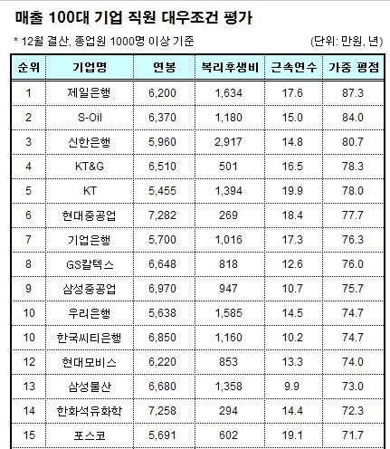 이번 평가 기준은 매출 100대 기업의 직원 평균 연봉, 1인당 복리후생비, 직원 평균 근무기간 등 3가지를 항목별로 100점(1위)~1점(100위)의 가중점수를 부여한 뒤 평균점수를 산출해 순위를 매긴 것이다.