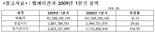 [프라임경제] 반도체용 본딩와이어 전문생산업체 엠케이전자(대표 최윤성, 033160)는 1분기 매출액 933억원, 영업이익 39억원, 당기순이익 28.3억원을 기록했다고 14일 발표했다.