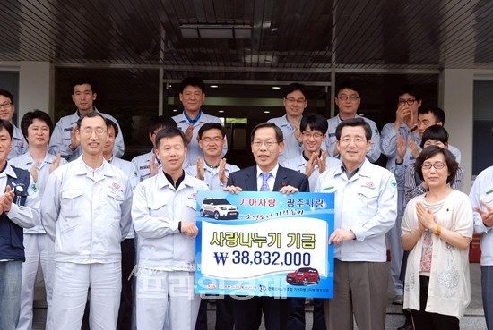 20일 기아차 광주공장 노사는 조남일 공장장, 박병규 지회장, 배승수 사회복지공동모금회 부회장이 참석한 가운데 광주공장 직원들이 모은 성금 3천 8832000원을 사회복지공동모금회에 전달했다.
