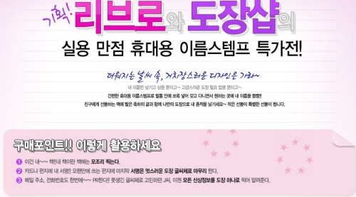 도장법인 도장샵은 인터넷전문도서몰 리브로와 책이름 스템프를 많은 사람들이 간단하게 사용을 할 수 있도록 하기 위해 자기 이름 3자만 들어가는 책이름 스템프를 990원에 무료 배송하는 ‘온 국민 책이름 스템프 1개 캠페인’을 실시한다.
