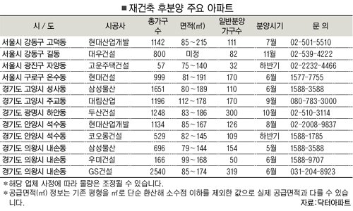 부동산포털 닥터아파트(www.DrApt.com)에 따르면 연내 후분양 하는 재건축 아파트는 총 19곳 5천55가구로 작년(1천568가구)과 비교해 약 3배 가량 늘었다.