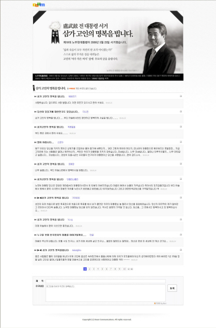 [프라임경제]온라인에도 노 전대통령의 서거를 안타까워하는 추모의 물결이 일고 있다. 다음은 노무현 전대통령 서거 이후 뉴스 서비스 및 아고라 서비스 등을 중심으로 이에 대한 폭발적인 트래픽이 나타나고 있으며, 아고라 추모 청원 및 추모 스페셜 페이지를 통해 20만명의 네티즌이 노무현 전대통령을 추모했다고 설명했다.