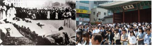 | <사진= 1919년 광무황제 조문과 노무현 전대통령의 분향소가 같은 장소인 덕수궁 대한문에 마련된 것은 우리 민족의 역사성이다> | ||