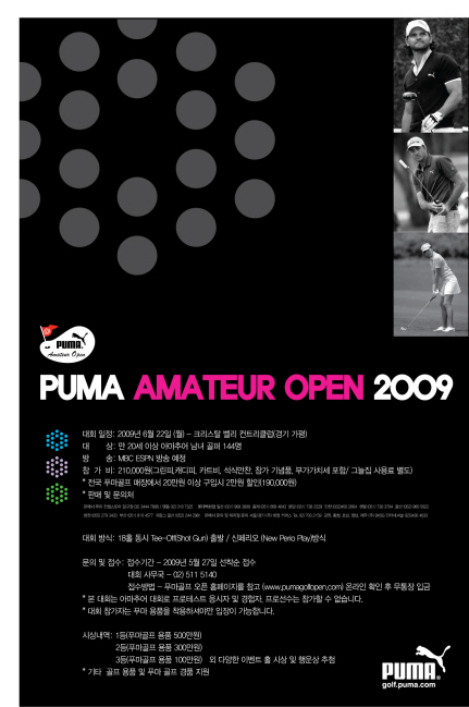 MBC ESPN을 통해 방송될 이번 대회는 ‘2009 푸마 아마추어 오픈’은 아마추어 골프 대회로 프로 테스트 응시자 및 경험자, 프로선수는 참가가 제한되어 있으며, 모든 참가자들은 적어도 한개 이상의 푸마 용품을 착용 또는 소지해야만 입장이 가능하다.