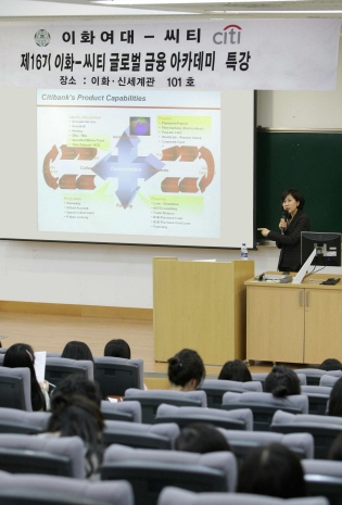 이화여대 출신으로 한국씨티은행 기업금융상품본부의 본부장을 맡고 있는 유명순 본부장은 이날 강의에서 후배들에게, "후배들의 진지한 눈빛과 열정이 사회 선배로서 다시 한번 책임감을 느끼게 한다"며 특강에 임했다.