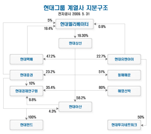 현대그룹은 현재 현대엘리베이터가 현대상선 지분 19.30%를 보유한 최대주주다. 현대상선은 다시 현대택배, 현대증권, 현대경제연구원, 현대아산, 현대유엔아이, 동해해운, 해영선박 등 등 주력 계열사에 출자한 지분구조를 갖추고 있다.