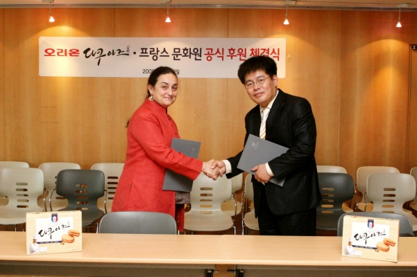 | ㈜오리온과 프랑스 문화원이 26일 ‘다쿠아즈 미’ 후원계약을 체결했다. 사진 왼쪽은 프랑스 문화원장 로르 쿠드레 로(Laure COUDRET LAUT), 오른쪽은 ㈜오리온 안용준 마케팅 부문장. | ||